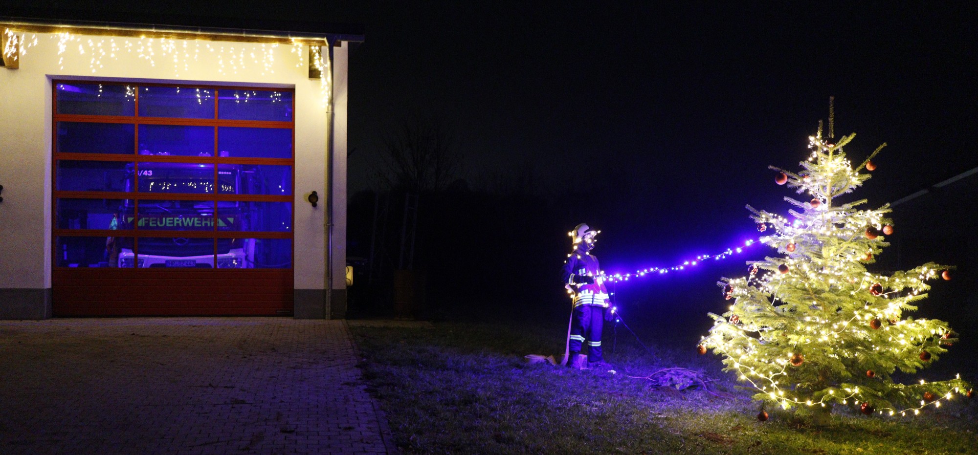 Der Baum hat nun einen prominenten Platz vor unserem Feuerwehrhaus erhalten. Und die Dekoration ist wieder mit engem Bezug zu unserem Lieblingshobby Feuerwehr.